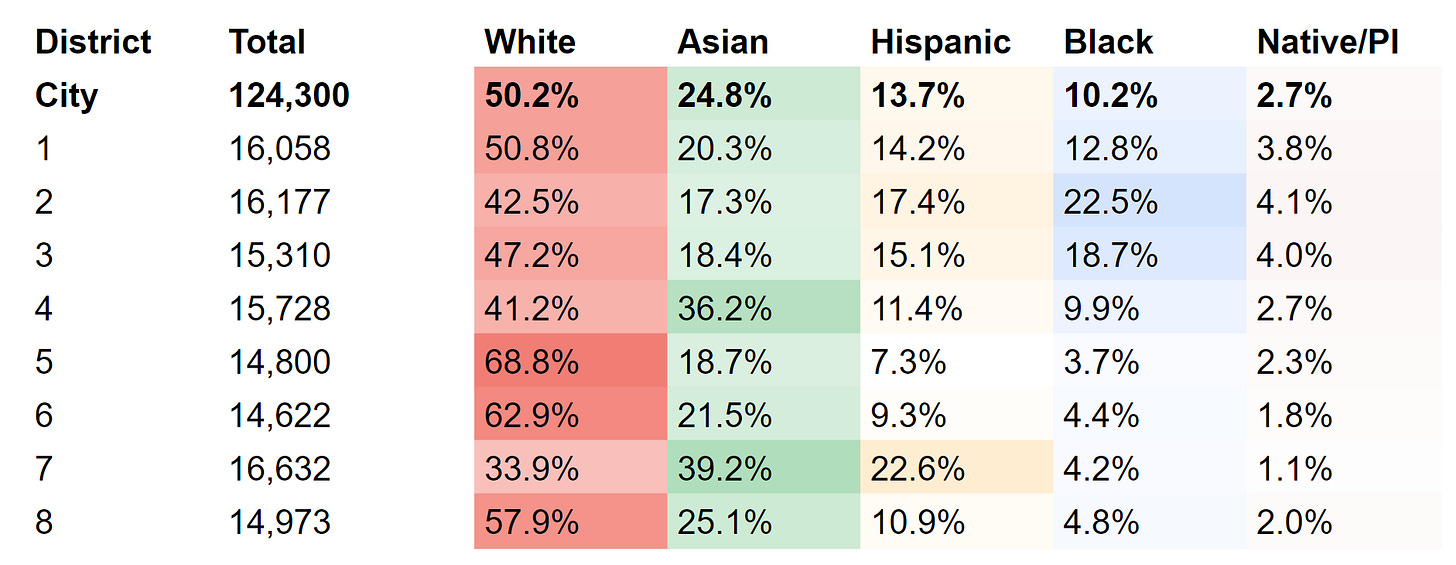 Unsurprisingly, the precinct is one of the city’s most diverse. As of the 2020 census, 33% of its residents are non-Hispanic white, 28% are Black, 22% are Hispanic/Latino, and 17% are Asian. Almost certainly, voters of all races were more likely to opt for a third-party candidate here than for the Republican nominee. Behold a truly breathtaking case of political polarization at its most far-reaching!