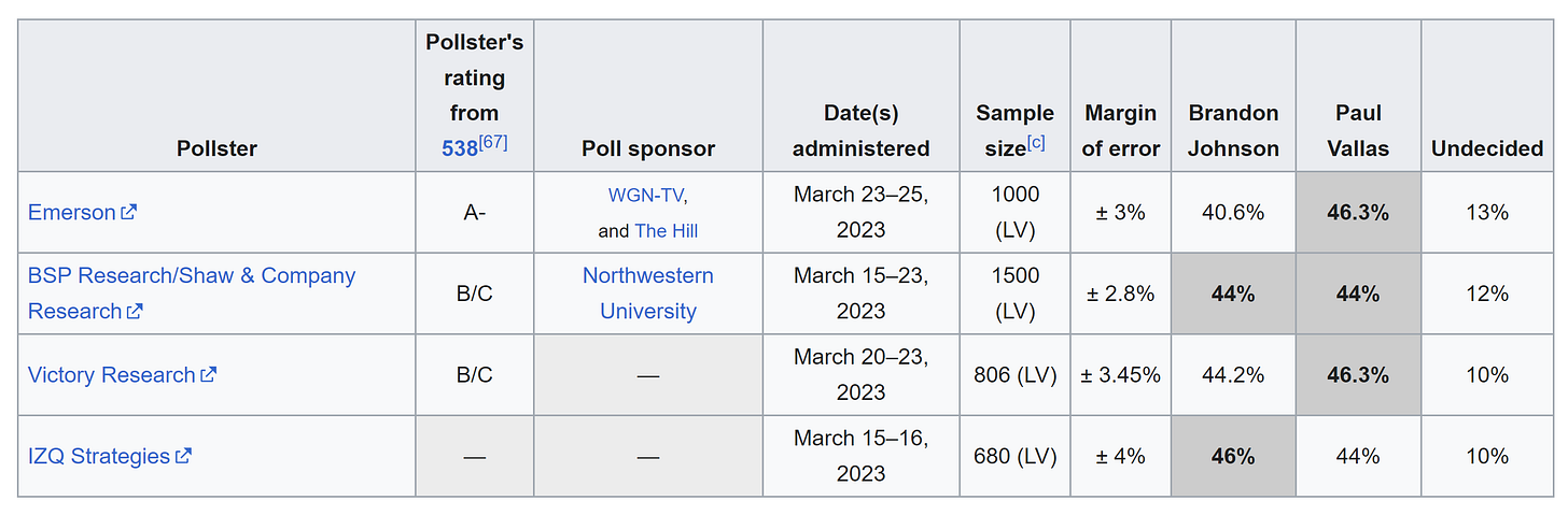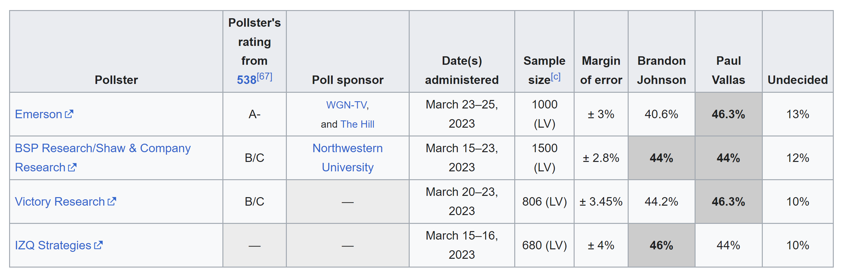 Wilson endorsed Vallas in the runoff, which was expected due to their similar politics, while Lightfoot made no endorsement (which is probably for the best, as any endorsement of hers would probably hurt the endorsed candidate). It’s likely that a number of Wilson voters will follow his lead and vote for Vallas over conservative politics and crime fears, but most Black voters will probably line up behind Johnson thanks to racial voting. García has endorsed Johnson, but it’s unclear if Johnson can win most of his voters, and most polls show Vallas winning among Latino voters. Though Vallas is not Latino, he is helped by his (Greek) last name, which is Spanish-passing enough that a recent poll found one-third of Latino Chicagoans think Vallas is Latino.
