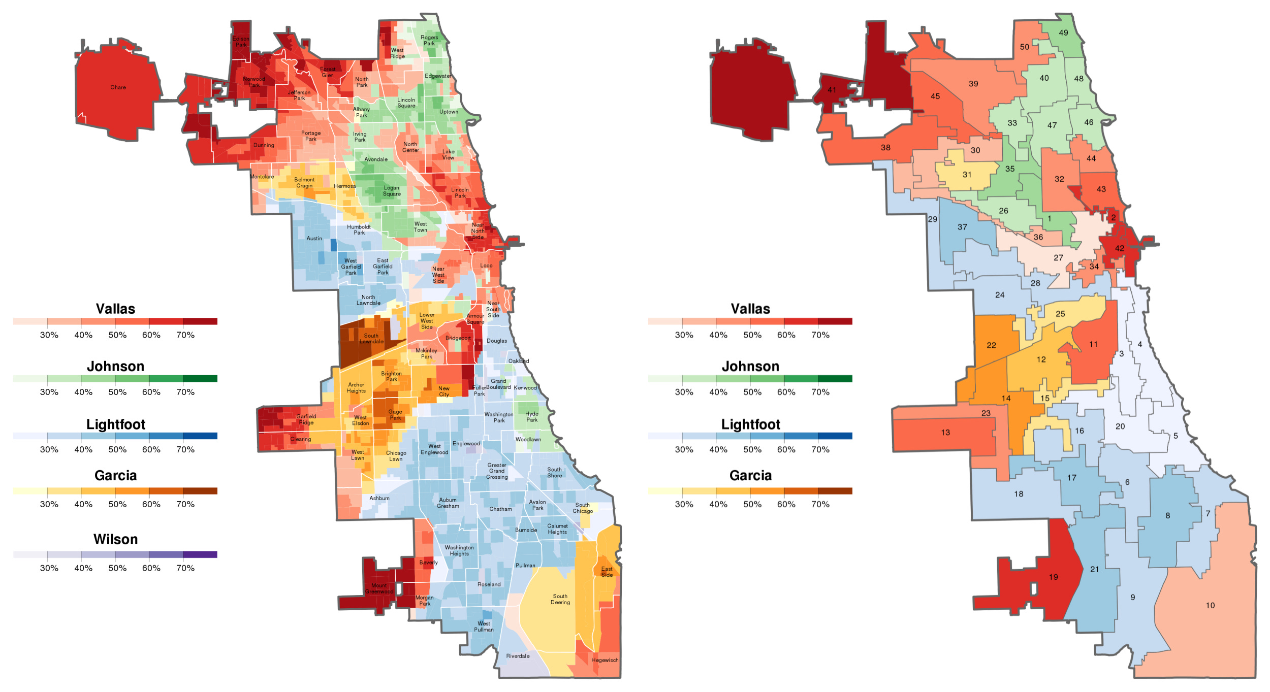 It’s been over a month since the first round of Chicago’s municipal elections, and the runoff is days away. A tight contest has developed in the mayoral race between conservative-leaning former education superintendent Paul Vallas and progressive-leaning county commissioner Brandon Johnson, both of whom emerged from the crowded primary ahead of incumbent Lori Lightfoot. In this article, I discuss the lead-up to this election and explore what the runoff map could look like.