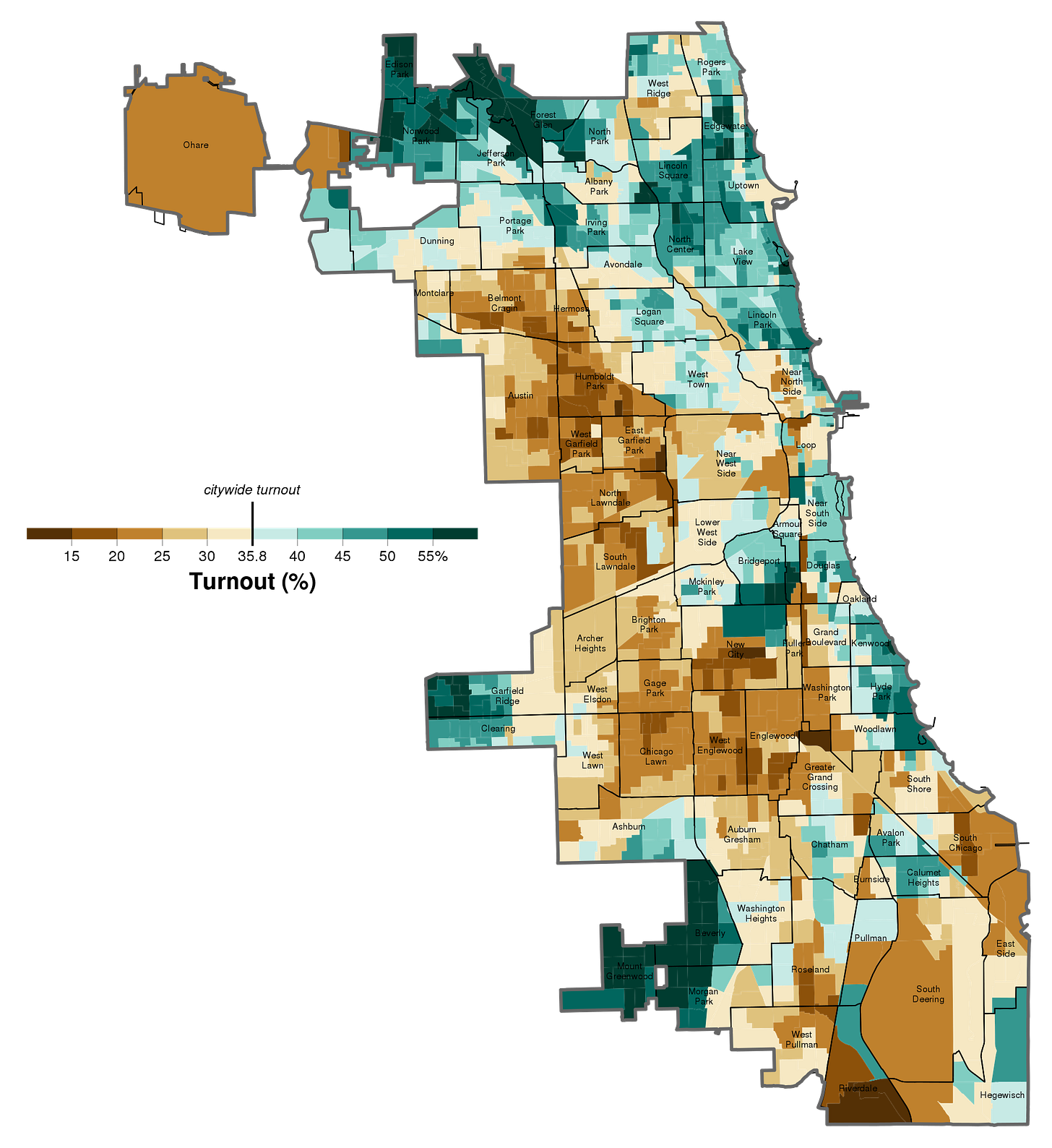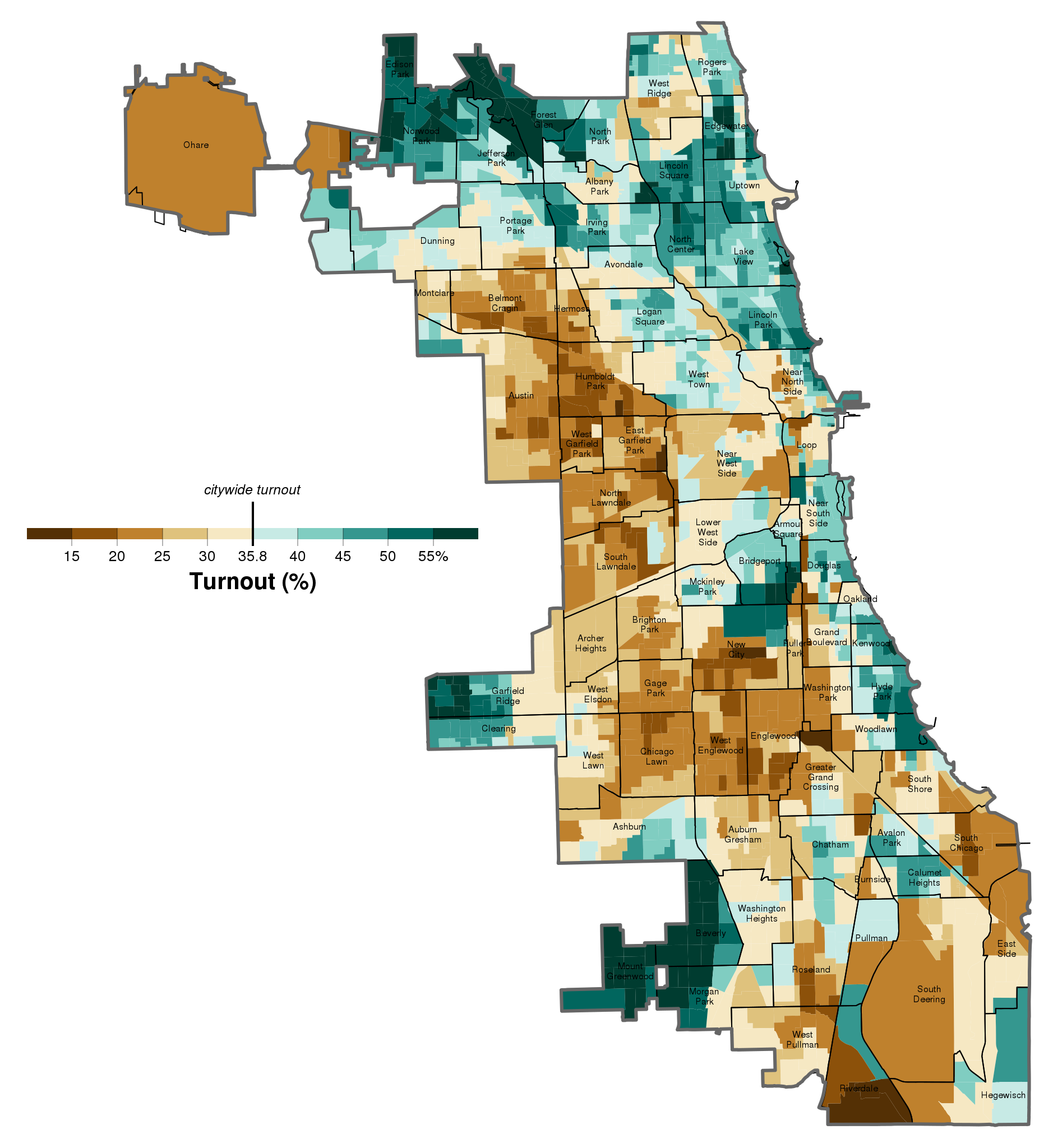 As the second-place finisher in the first round, Johnson obviously has a steeper hill to climb to reach 50%. That being said, he also has more room to grow in support since his first round support occupied much less of the Black lane than Vallas’s did of the white lane. He could also stand to benefit from boosting turnout, as the city’s whiter neighborhoods far outpaced its mostly Black (and Latino) neighborhoods in first round turnout: